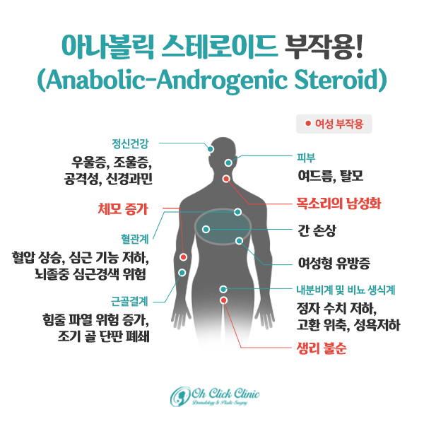 남성의 아나볼릭 스테로이드의 전형적인 부작용으로는 고환 위축, 정자 수/운동성 감소, 여성형 유방, 탈모 및 여드름이 있습니다. 여성의 경우 목소리의 남성화, 체모 증가, 월경불순 등의 부작용이 나타날 수 있다. 또한 성별을 불문하고 혈압 상승과 나쁜 콜레스테롤 수치는 뇌졸중, 심장마비 등 심혈관계 질환의 위험을 높인다. 심장마비, 간암 및 간부전도 아나볼릭 스테로이드 사용의 부작용으로 발생할 수 있는 문제입니다.