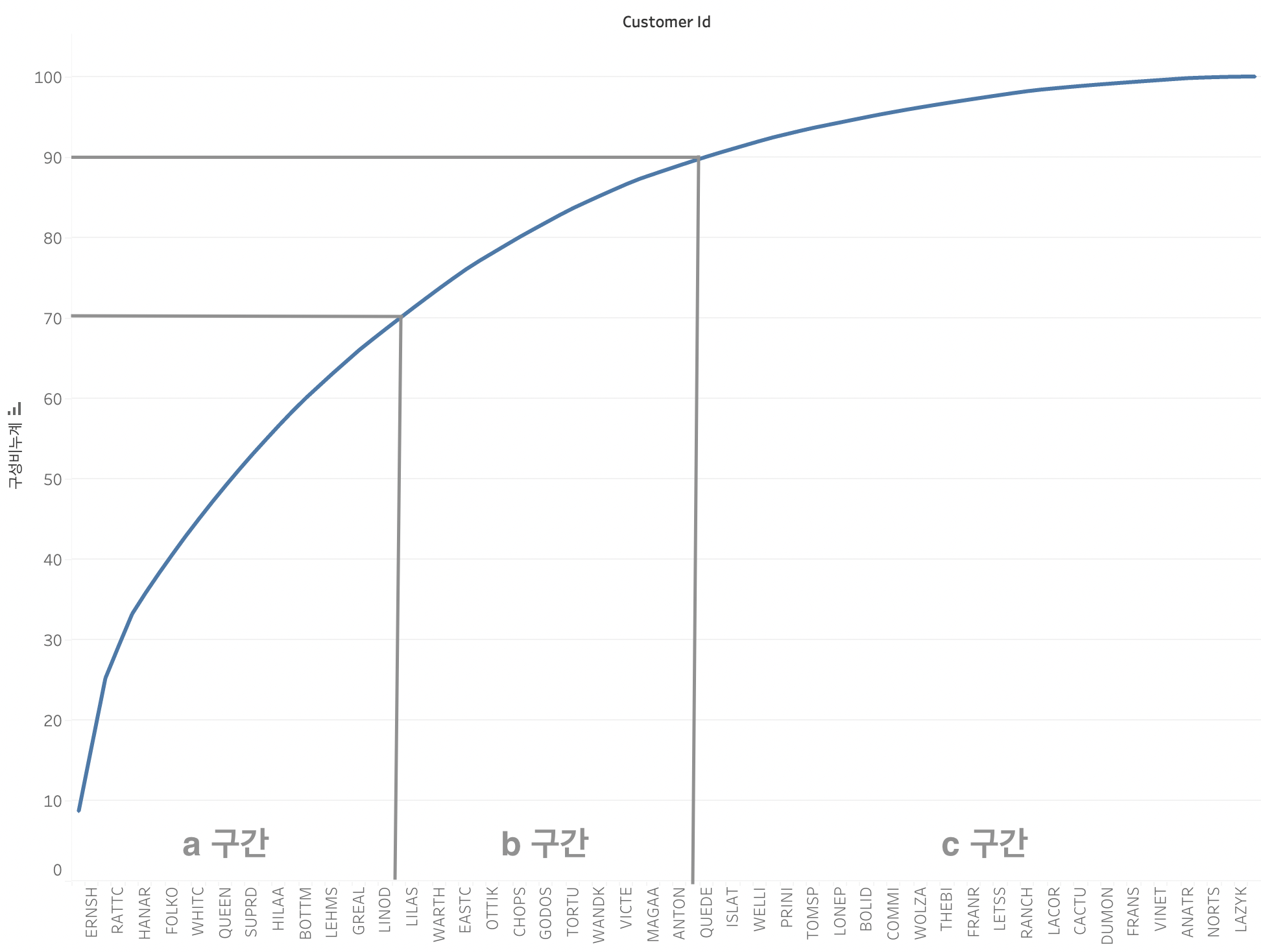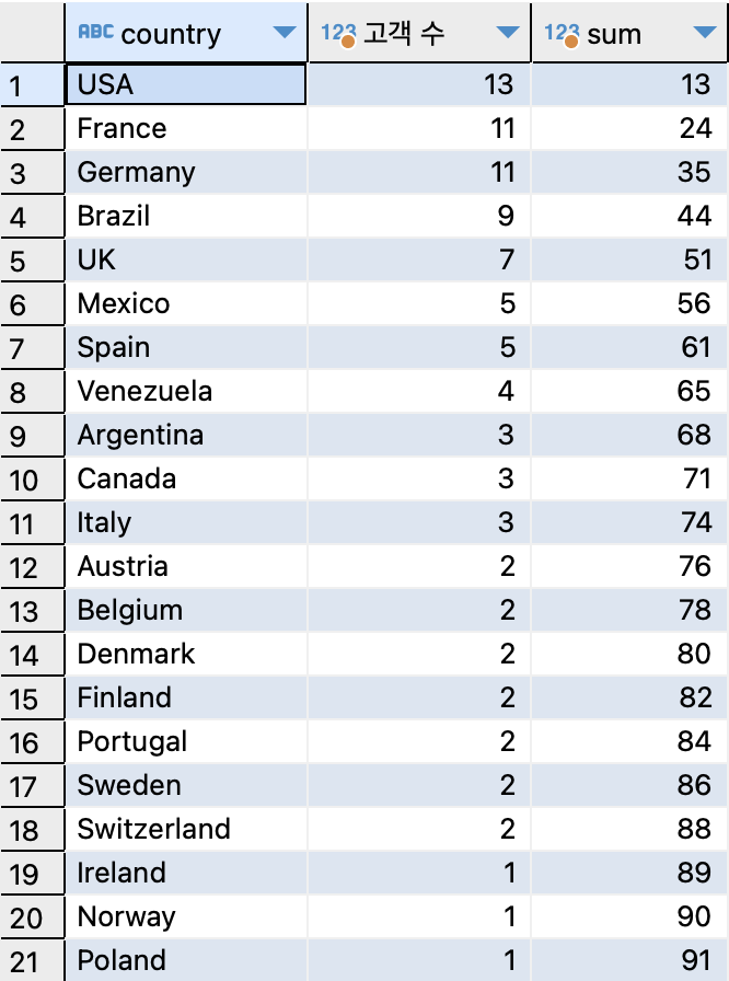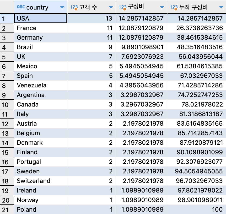 , sum("구성비") over (order by "고객 수" desc, country) as "누적 구성비"