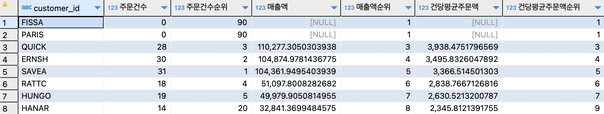 ✅ 지역 별 고객수, 매출액, 주문건수 : cte_country_group_customer_amount_ordercnt