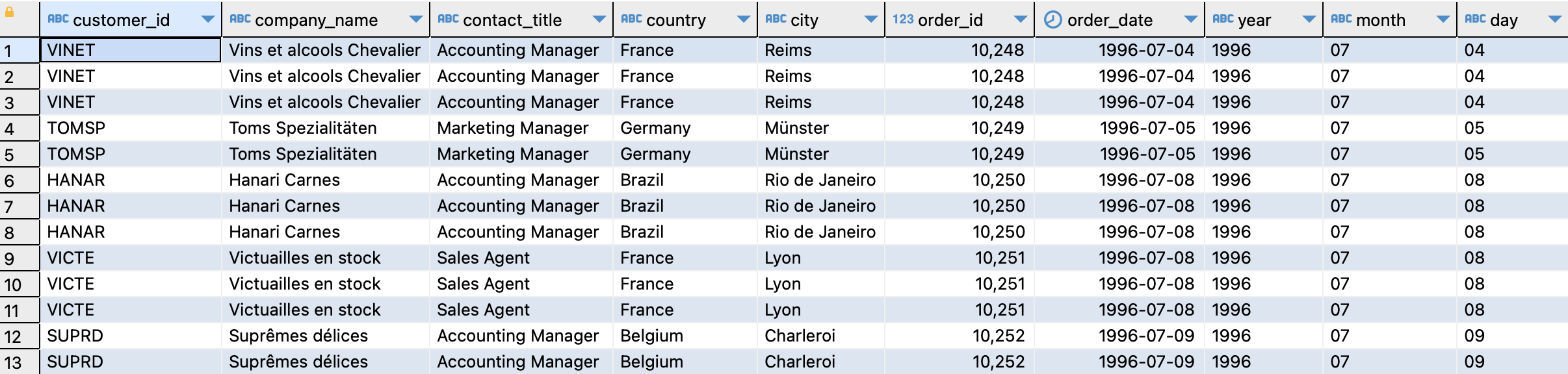 -- customers : coustomer_id, company_name, cantact_title, country, city