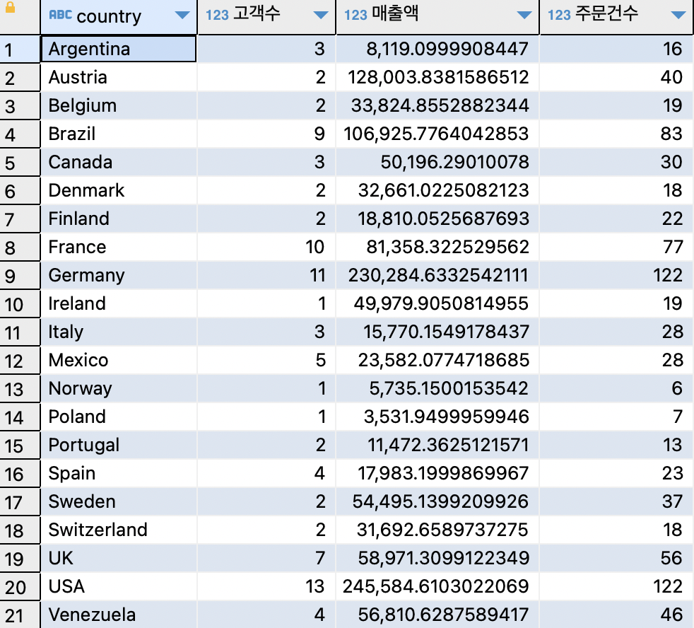 select country, count(distinct customer_id ) as "고객수", sum(amount) as "매출액", count(distinct order_id) as "주문건수"