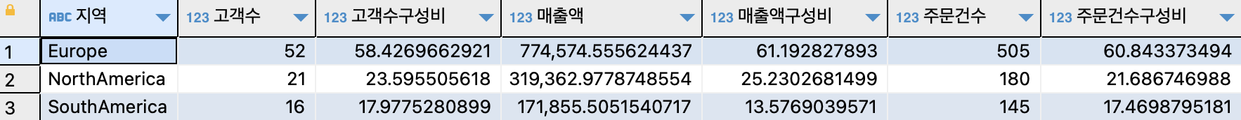 ✅ 지역 별 고객수, 매출액, 주문건수 구성비 : cte_country_group_ratio