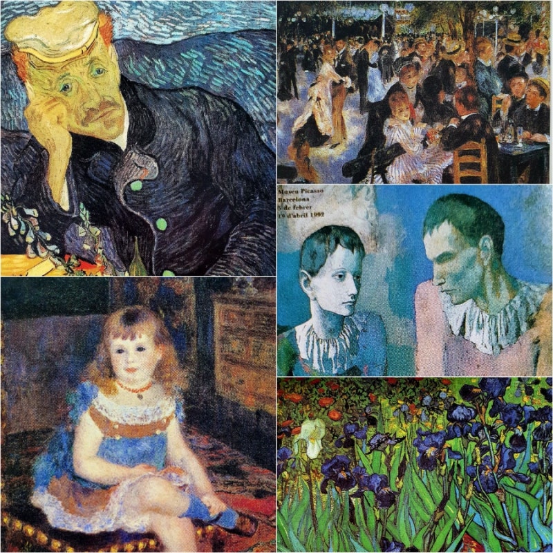 (왼쪽 위부터 시계 방향으로) 반 고흐 <加歇医生的肖像>1890, O/C, 67X56cm, 스위스 프라이빗 / 르누아르 1876, O/C, 78.7X113cm, 개인 소장품 / 피카소 포스트 / 반 고흐 1889, O/C, 71.1X93cm, 폴 게티 센터, 로스앤젤레스 / 르누아르 1876, O/C, 98X 70,5cm, 브리지스톤 미술관