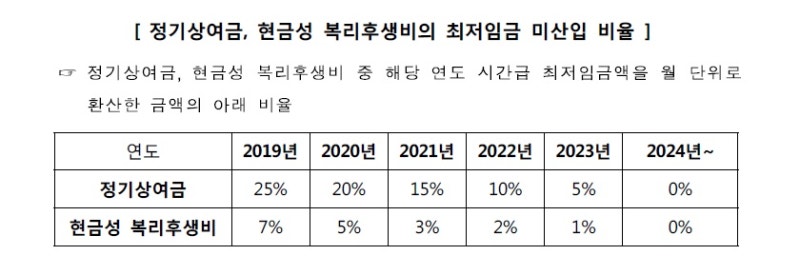 아래 그림과 같이 최저임금에 산입되지 않는 정기상여금과 현금성 수당은 내년부터 매년 줄어들어 임금에 포함된다.