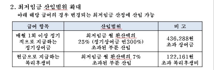 또 최저임금 산입 범위를 확대해 다음해 1월 1일부터 월 1회 이상 지급하는 통상임금을 최저임금에 산입한다. 다만, 정기상여금 및 현금성 복리후생의 경우 최저임금의 범위를 다음과 같이 확대한다.